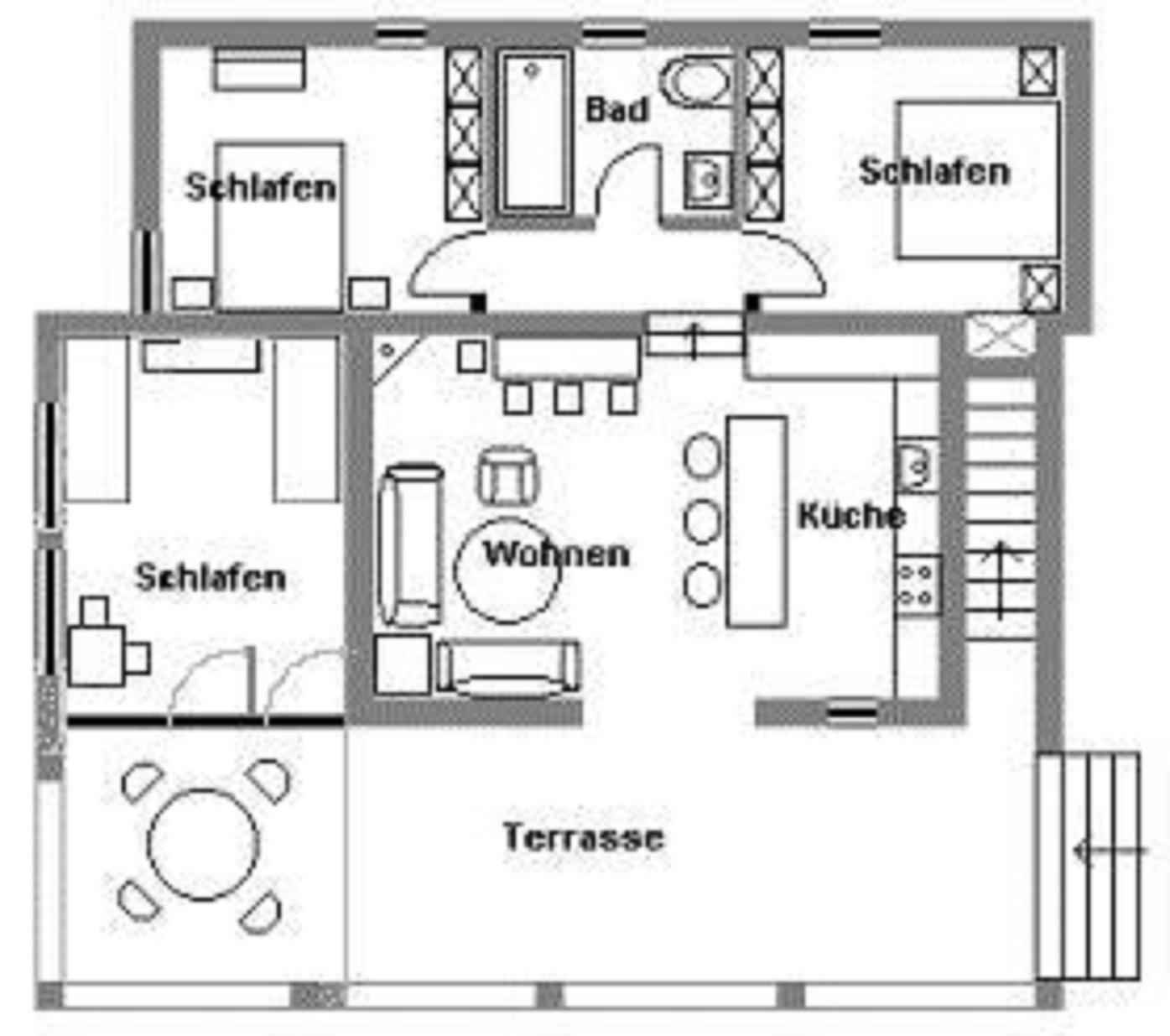 Grundriß Im Chalet können 6 Personen Urlaub machen. Zwei Schlafzimmer haben zwei Singelbetten, in dem dritten Schlafzimmer befinden sich drei Betten.